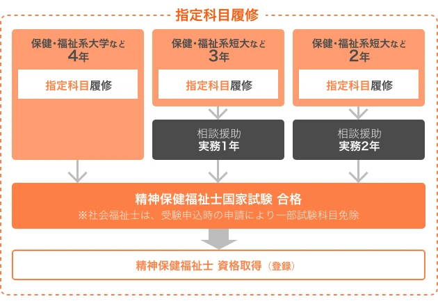 また、大学・短大等を卒業していない人は、相談援助実務を4年間経験していれば、精神保健福祉士一般養成施設等で1年以上学んだ後に受験資格を得られます。